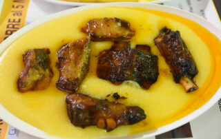 Per quanto riguarda le pietanze proposte alla Fiera della Polenta, tra le novità di quest’anno da segnalare lo spezzatino di muflone, il pasticcio di pesce, le nuove pizze, coda alla vaccinara, polenta con sarde in saor, polenta con i saltarei, tortelloni di Valeggio fatti a mano con ripieno di polenta e salsiccia o polenta e gorgonzola, polenta col pessin. Non mancano poi alcune pietanze della tradizione quali pastisada de caval, polenta e baccalà, frittura di pesce, risotto alla vigasiana, tortellini di Valeggio fatti a mano, bigoli con l’anara, grigliate di carne, dolci serviti in monoporzione oppure nel classico piatto misto con farina di mais.