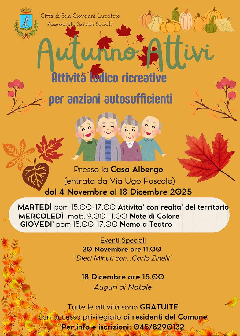 Tutte le attività del progetto “Autunno Attivi 2025” saranno ad ingresso libero, con comunicazione iniziale al numero dei servizi sociali 045.8290132, disponibile anche per informazioni. «Prosegue con Autunno Attivi il progetto di socializzazione e stimolazione cognitiva per gli anziani lupatotini presso la Casa Albergo, che diviene così sempre più luogo d’incontro e relazione – spiega l’assessore al sociale Maurizio Simonato –. L’amministrazione comunale ha reso questo progetto continuativo durante tutto l’anno, con delle piccole pause organizzative, dopo aver constatato il gradimento espresso dalle persone che hanno finora partecipato a queste attività. Ciò è motivo di stimolo per tutti noi per impegnarci ancora maggiormente per i nostri anziani e ringrazio gli uffici del sociale e le realtà del territorio che rendono ricco questo progetto».